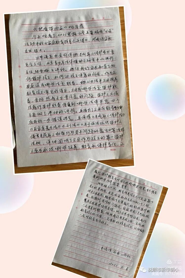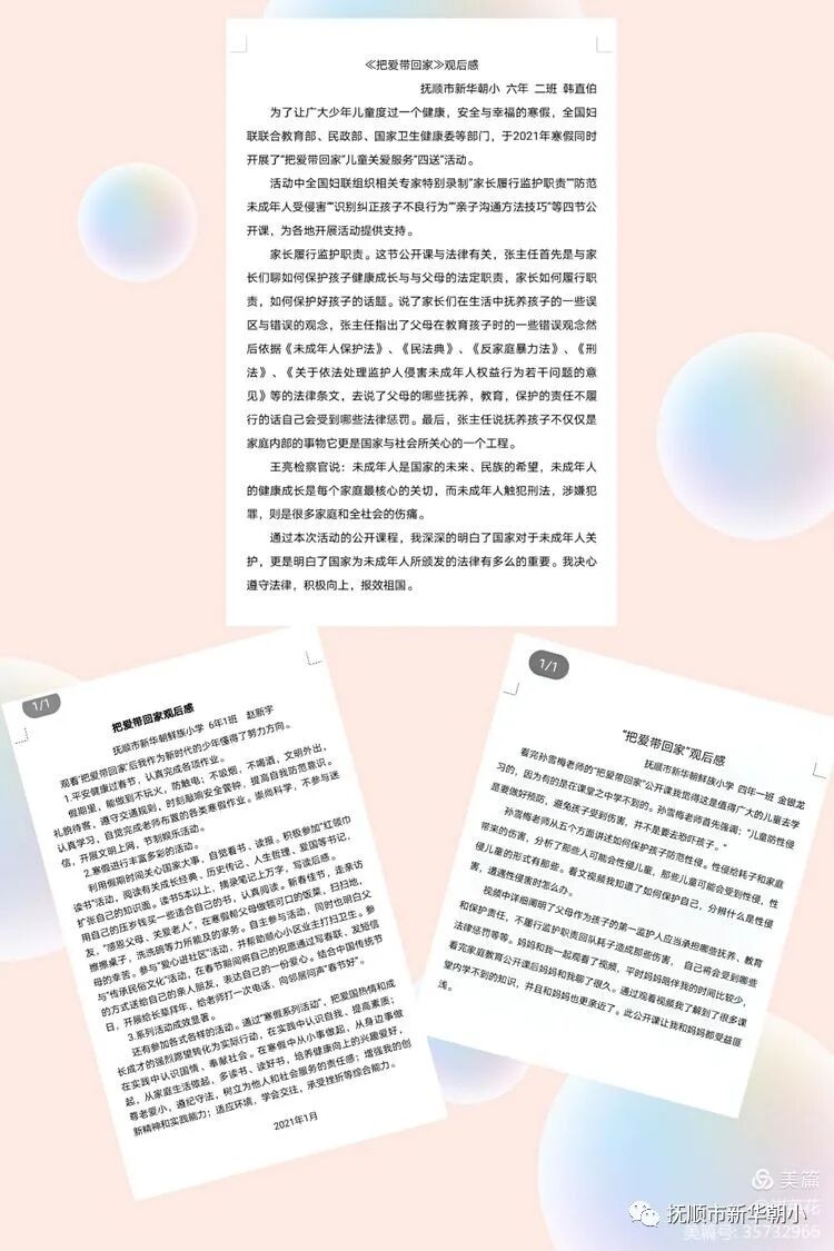 德育處通過微信群布置各班班主任組織家長和學(xué)生觀看了全國婦聯(lián)制作的把愛帶回家“依法履行監(jiān)督職責(zé)是父母的義務(wù)”、“家庭教育指導(dǎo)公開課”、“父母如何預(yù)防未成年人的不良行為”等短視頻,并寫體會(huì)活動(dòng)。