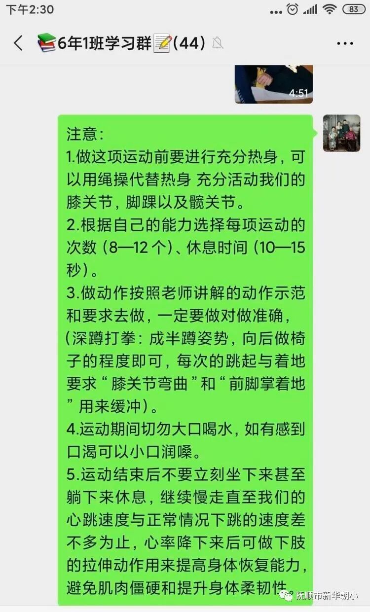 宅在家里也不放松體育鍛煉。體育組劉鳳博老師以推送錄播形式進(jìn)行室內(nèi)運動指導(dǎo),金明秀老師在學(xué)習(xí)群中提出具體要求。